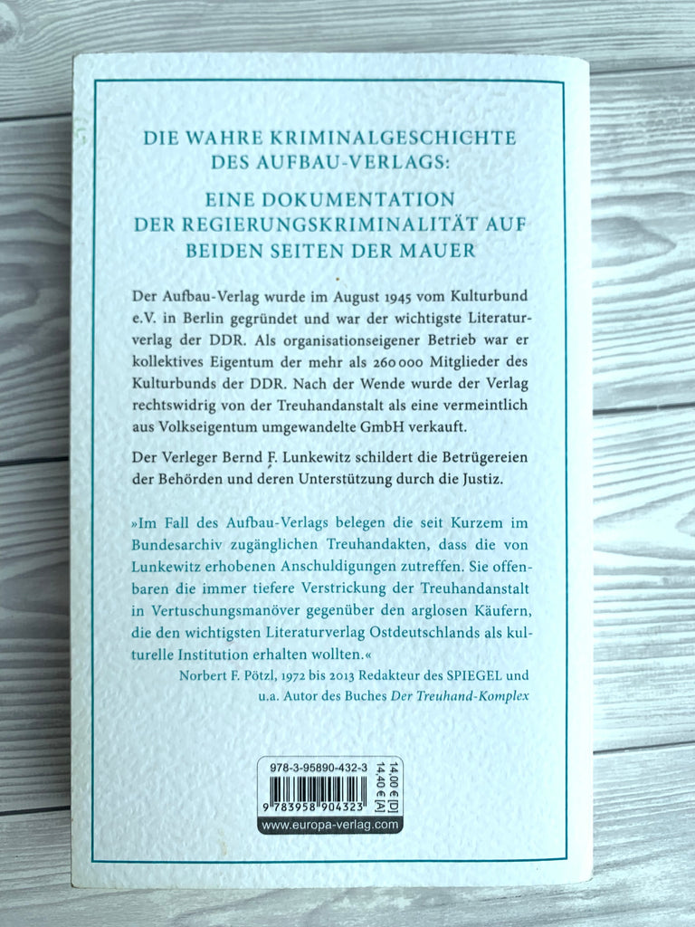 Die Geschichte des Aufbau Verlages – von der Gründung 1945 über seine Profilierung als bedeutendster Verlag der DDR und dem drohenden Untergang nach der Wende 1989 bis zu seinem rechtswidrigen Verkauf durch die Treuhandanstalt an eine vom Verleger Bernd F. Lunkewitz angeführte Investorengruppe. Was danach folgte, ist ein Wirtschaftskrimi ersten Ranges, bei dem sich die Treuhand als kriminelle Vereinigung entlarvte und die deutsche Justiz eine unrühmliche Rolle spielte. Nach wie vor kämpft Bernd F. Lunkewitz um sein Recht.