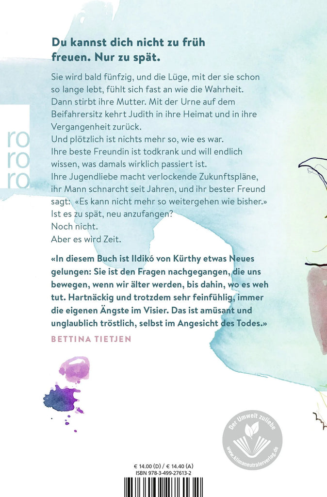 In diesem Buch ist Ildikó von Kürthy etwas Neues gelungen: Sie ist den Fragen nachgegangen, die uns bewegen, wenn wir älter werden, bis dahin, wo es weh tut. Hartnäckig und trotzdem sehr feinfühlig, immer die eigenen Ängste im Visier. Das ist amüsant und unglaublich tröstlich, selbst im Angesicht des Todes. (Bettina Tietjen) ("Bettina Tietjen")