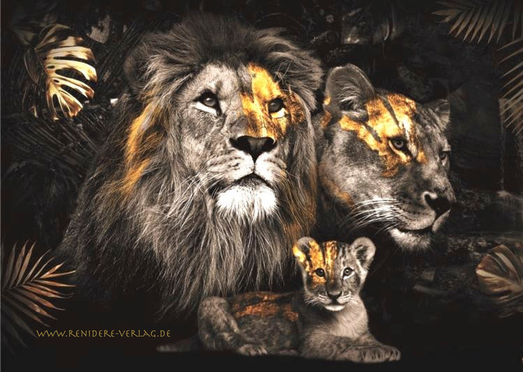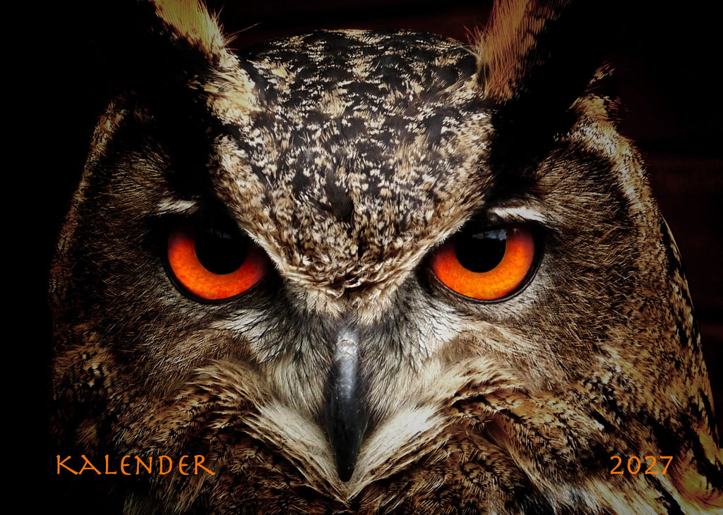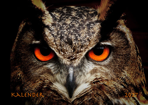 Kalendervorderseite mit Eule - Rückseite mit Löwenfamilie