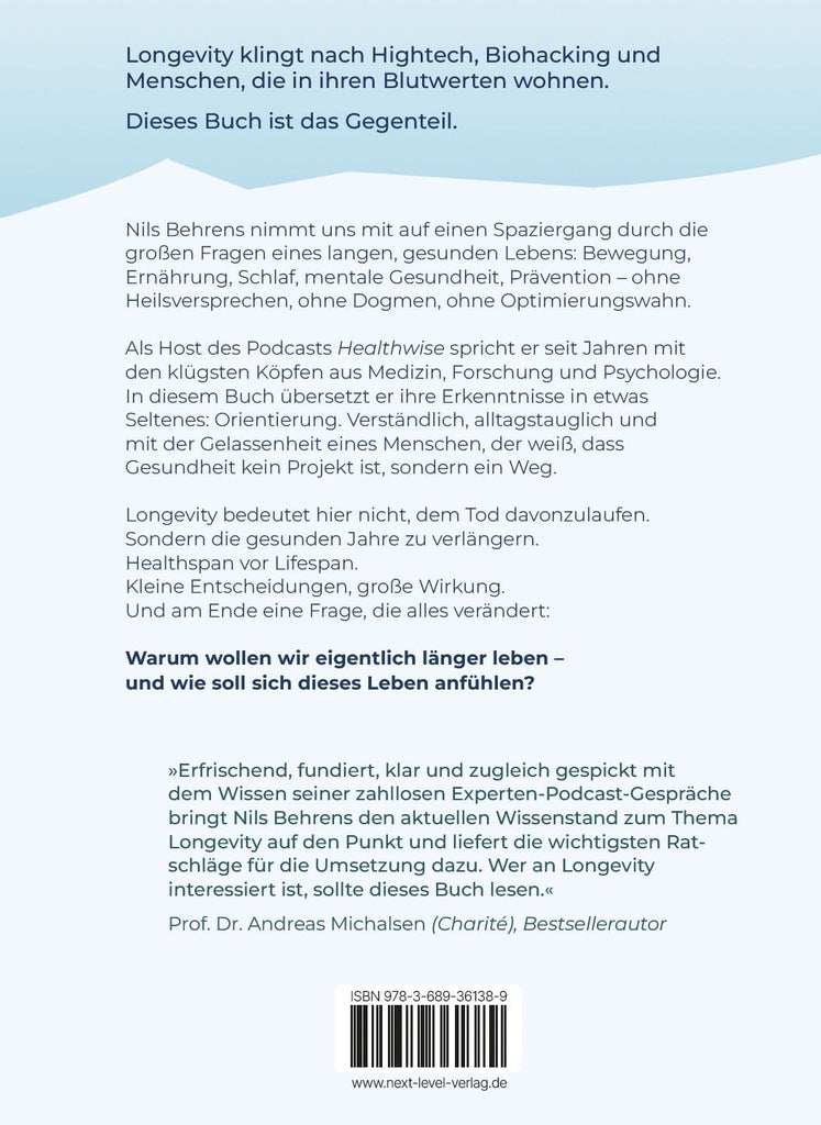 Oder wie es der Bestseller-Autor Prof. Dr. Andreas Michalsen (Charité) formuliert: „Erfrischend, fundiert, klar und zugleich gespickt mit dem Wissen seiner zahllosen Experten-Podcasts bringt Nils Behrens den aktuellen Wissenstand zum Thema Longevity auf den Punkt und liefert die wichtigsten Ratschläge für die Umsetzung dazu. Wer an Longevity interessiert ist, sollte dieses Buch lesen.“