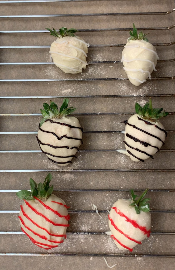 Die Erdbeeren sind mit weisser und brauner Schokolade überzogen.